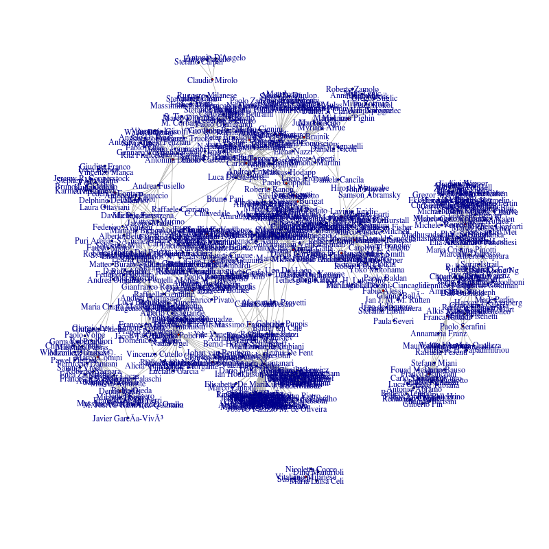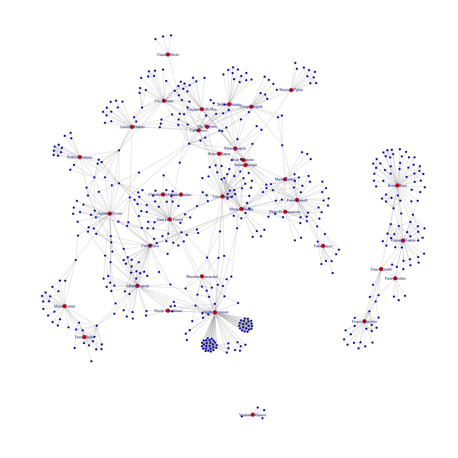 The collaboration network for the computer science members of the Department of Mathematics and Computer Science at the University of Udine, Italy. Red, larger nodes correspond to the computer scientists at the department and are labelled with their names. Blue, smaller nodes are their anonymous co-authors