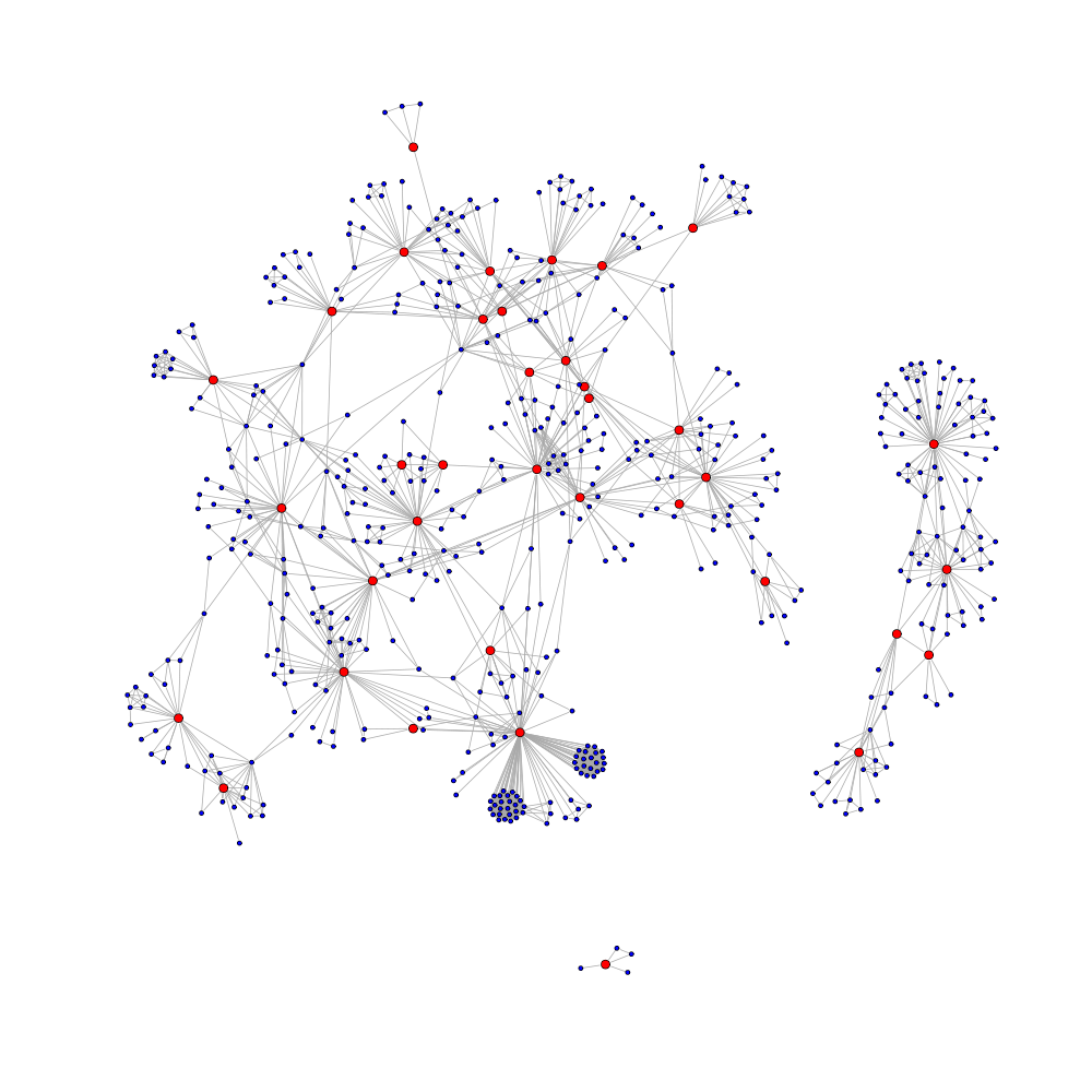 The collaboration network for the computer science members of the Department of Mathematics and Computer Science at the University of Udine, Italy. Red, larger nodes correspond to the computer scientists at the department, and blue, smaller nodes are their co-authors.
