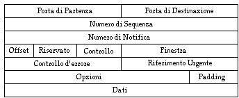 Lo specifico formato dell'intestazione per il protocollo TCP è quello illustrato nella figura seguente