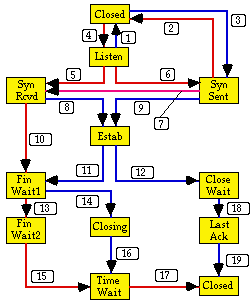 Una connessione TCP progredisce da uno stato all'altro in risposta agli eventi che sono rappresentati dalle chiamate eseguite dalle procedure di servizio del livello superiore, ossia, OPEN, SEND, RECEIVE, CLOSE, ABORT e STATUS alle quali si aggiungono i segmenti in arrivo, particolarmente, quelli conteneti i flag SYN, ACK, RST e FIN, oltre ai timeout.